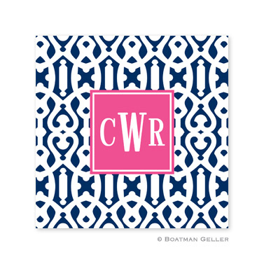 Our personalized paper coasters make a great hostess gift, and are perfect for your own entertaining. 4×4. Set of 50 – $30. Shown in navy with raspberry accent and white pattern inset.