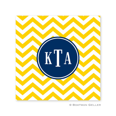Our personalized paper coasters make a great hostess gift, and are perfect for your own entertaining. 4×4. Set of 50 – $30. Shown in sunflower with navy accent and white pattern inset.