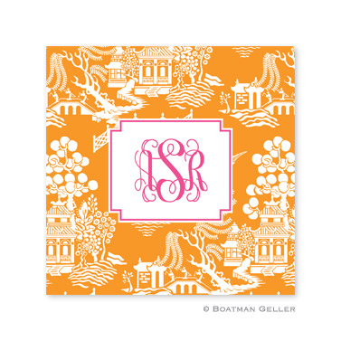 Our personalized paper coasters make a great hostess gift, and are perfect for your own entertaining. 4×4. Set of 50 – $30. Shown in tangerine with bubblegum accent and white pattern inset.
