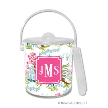 Lucite bucket with tongs. This chic double-walled acrylic ice bucket is a great party companion. Includes tongs and a personalized custom insert. 6.75 x 6 x 7. Hand-wash only. Extra inserts available (see ice bucket insert tab for ordering). Pattern and color shown as is. Custom monogram/personalization options available.