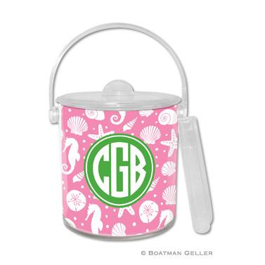 Lucite bucket with tongs. This chic double-walled acrylic ice bucket is a great party companion. Includes tongs and a personalized custom insert. 6.75 x 6 x 7. Hand-wash only. Extra inserts available (see ice bucket insert tab for ordering). Shown in bubblegum with kelly accent.