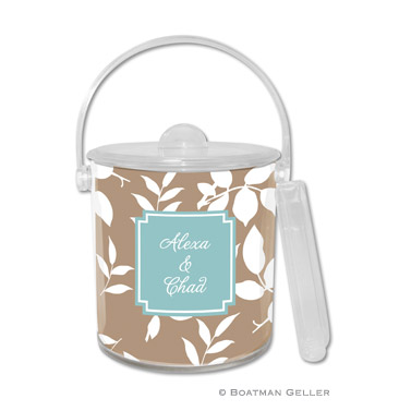 Lucite bucket with tongs. This chic double-walled acrylic ice bucket is a great party companion. Includes tongs and a personalized custom insert. 6.75 x 6 x 7. Hand-wash only. Extra inserts available (see ice bucket insert tab for ordering). Shown in mocha with slate accent.