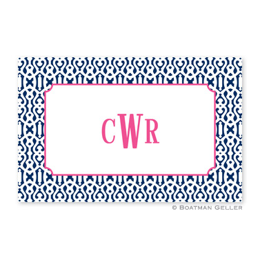Make mealtime anything but ordinary with our custom laminated placemats. Easily wipes clean. Back of placemat has same all over pattern as front unless indicated by turned corner Sold Seperately – $26 each. Shown in navy with raspberry accent and white pattern inset.