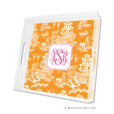 Our lucite trays are so stylish. Perfect for entertaining indoors or out. Available in 3 different sizes, all trays include one insert, extra inserts available to order. Large 11×17 – $104, Small 8.5×11 – $58, Square 12×12 – $95. Extra inserts available, see insert tab for ordering. Shown in tangerine with bubblegum accent and white pattern inset.