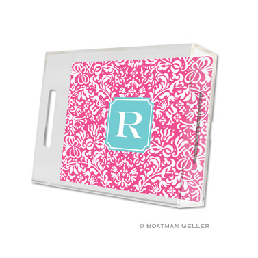 Our lucite trays are so stylish. Perfect for entertaining indoors or out. Available in 3 different sizes, all trays include one insert, extra inserts available to order. Large 11×17 – $104, Small 8.5×11 – $58, Square 12×12 – $95. Extra inserts available, see insert tab for ordering. Shown in raspberry with teal accent and white pattern inset.