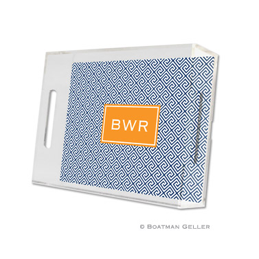 Our lucite trays are so stylish. Perfect for entertaining indoors or out. Available in 3 different sizes, all trays include one insert, extra inserts available to order. Large 11×17 – $104, Small 8.5×11 – $58, Square 12×12 – $95. Extra inserts available, see insert tab for ordering.. Shown in navy with tangerine accent and white pattern inset.