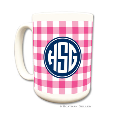 15 oz stylish ceramic mugs will perk up your morning. Also great for the office and your favorite co-worker. $22 each. Shown in raspberry with navy accent.
