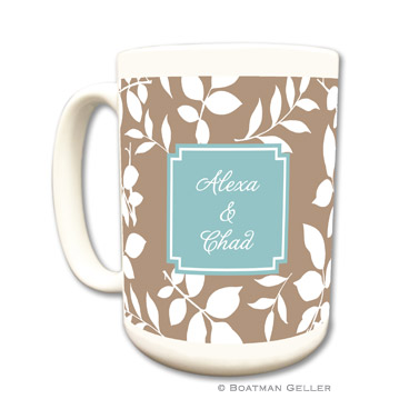 15 oz stylish ceramic mugs will perk up your morning. Also great for the office and your favorite co-worker. $22 each. Shown in mocha with slate accent.