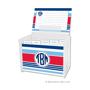 Keep your favorite recipes organized with this custom recipe box and cards. Horizontal lines are printed in the same ink color as your text that help keep handwriting neat, and are carried over to the back of the card. Each box comes with 5 tab dividers and 48 cards. Pattern and color shown as is. Custom monogram/personalization options available.