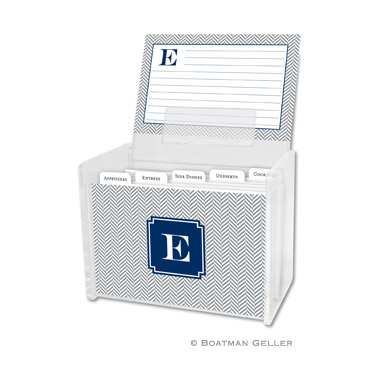 Keep your favorite recipes organized with this custom recipe box and cards. Horizontal lines are printed in the same ink color as your text that help keep handwriting neat, and are carried over to the back of the card. Each box comes with 5 tab dividers and 48 cards. Shown in gray with navy accent.