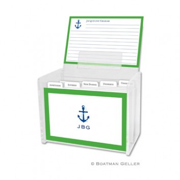 Keep your favorite recipes organized with this custom recipe box and cards. Horizontal lines are printed in the same ink color as your text that help keep handwriting neat, and are carried over to the back of the card. Each box comes with 5 tab dividers and 48 cards. Customize your Recipe Box with 100+ icons. Icons available in both color and silhouette styles. Comes with or without color accent border. Shown with kelly border, anchor icon 015, navy initials.