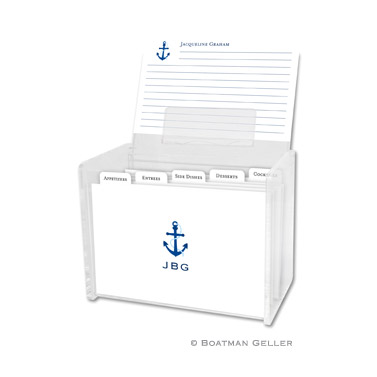 Keep your favorite recipes organized with this custom recipe box and cards. Horizontal lines are printed in the same ink color as your text that help keep handwriting neat, and are carried over to the back of the card. Each box comes with 5 tab dividers and 48 cards. Customize your Recipe Box with 100+ icons. Icons available in both color and silhouette styles. Comes with or without color accent border. Shown with no border, anchor icon C015, kelly initials.