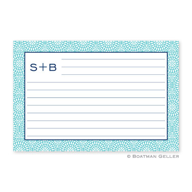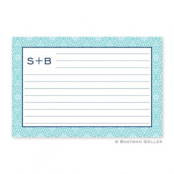 Share your favorite recipes with your friends and family on these personalized recipe cards. Each card has horizontal lines on both the front and back in the same ink color as your text allowing you to keep your handwriting neat. Available in pack of 24 count – $35 or 48 count – $55. Shown in teal with navy accent .