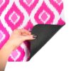 1. Indoor/outdoor. 2. 100% machine washable. 3. Polyester fabric face. 4. Non-skid neoprene rubber backing. 5. Low profile allows doors to pass over easily. 6. Custom made in America.