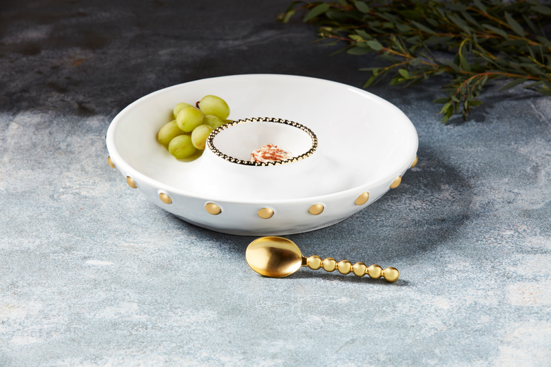 Stunning 2-piece set for serving snacks and dips Mottled ceramic chip and dip server with hand-painted bead detail Includes stainless steel spoon with bead handle Made from high-quality dolomite for durability