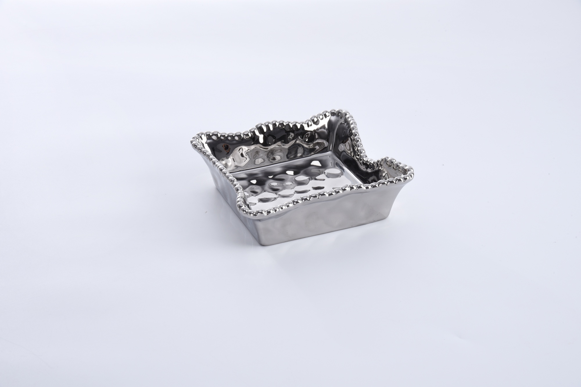 Porcelain cocktail napkin holder in Verona. Add a touch of luxury and elegance with this magnificent napkin holder. Also great for serving up small pastries, sliced fruit and appetizers. Striking and elegant silver titanium high-fired porcelain cocktail napkin holder. Food safe, dishwasher safe, oven safe to 350°. Tarnish and stain-free. Easy Care.