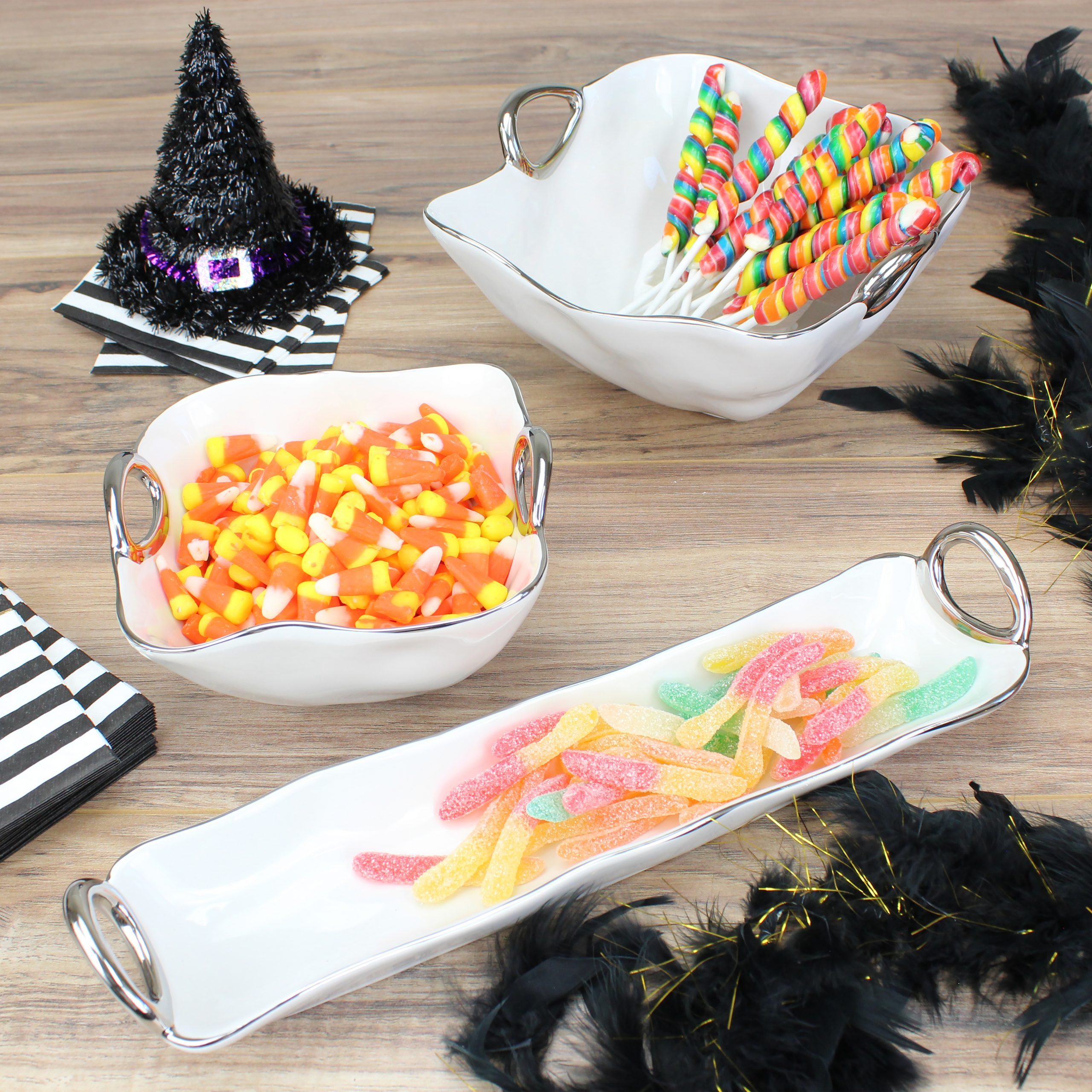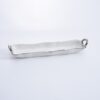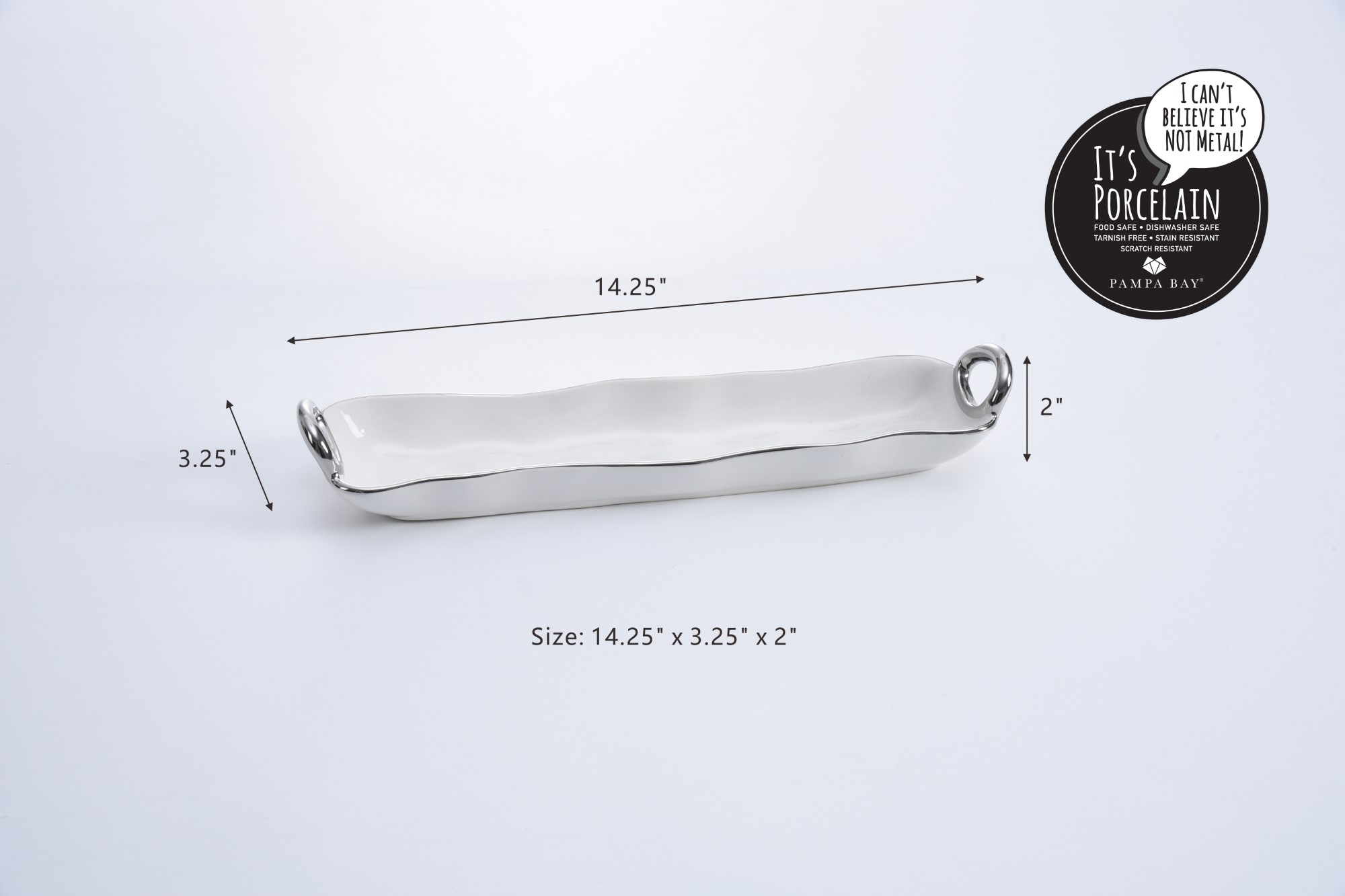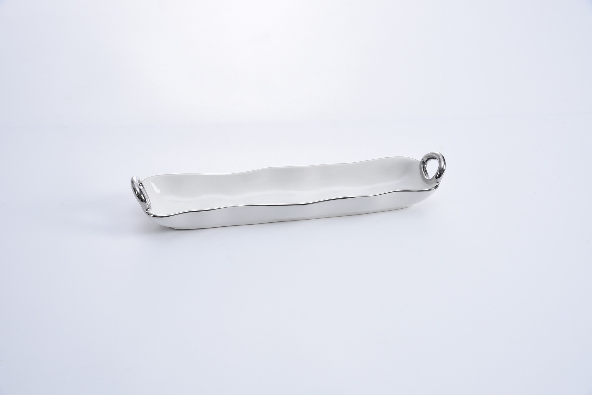 Cracker Tray in Handle with Style. Perfect for crackers, small cookies and other small treats. Stunning white porcelain with smooth and fluent handles in silver titanium. Food safe, dishwasher safe, oven safe to 350°. Easy Care.