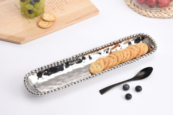 Cracker tray in Verona. Perfect for crackers, small cookies and other small treats. Striking and elegant titanium finished high-fired porcelain. Food safe. Dishwasher safe. Oven safe to 350°. Easy Care.