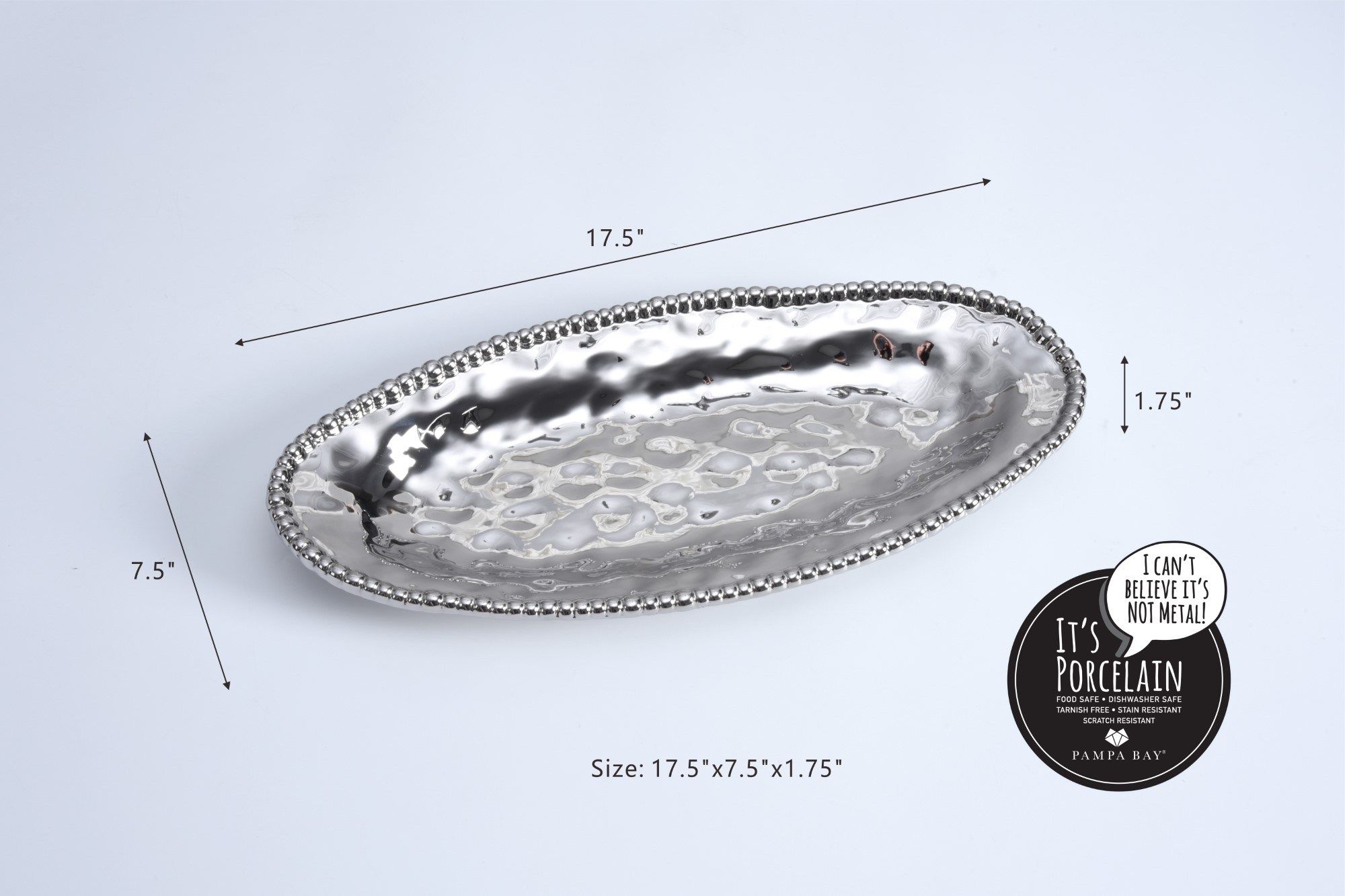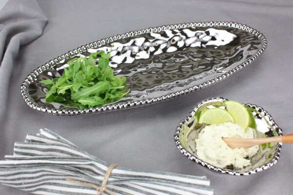 Large oval serving dish in Verona. The unique oval shape makes this platter great for serving a freshly sliced baguette, stuffed mushrooms or fruit. Asparagus, carrots, green beans, even a whole fish all are stunning on this piece. Striking and elegant titanium finished high-fired porcelain. Food safe. Dishwasher safe. Oven safe to 350°. Tarnish and stain-free. Easy Care.