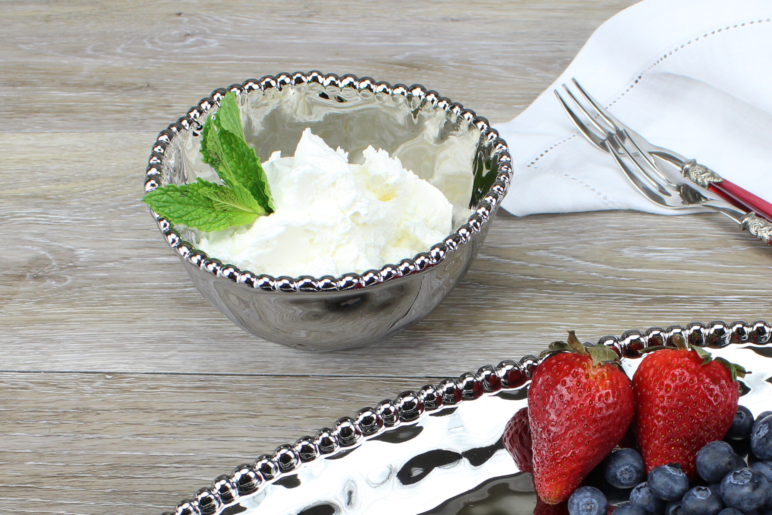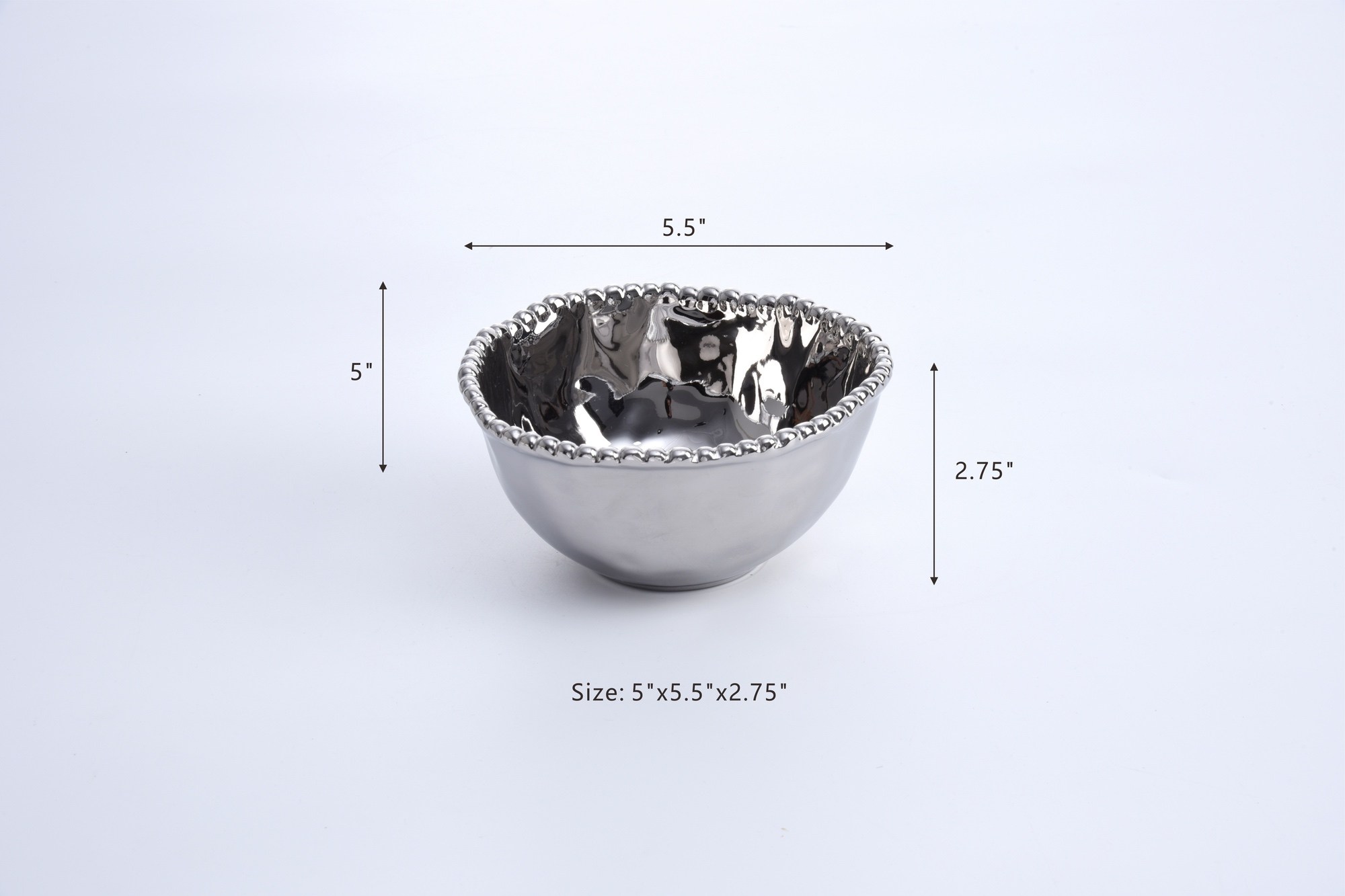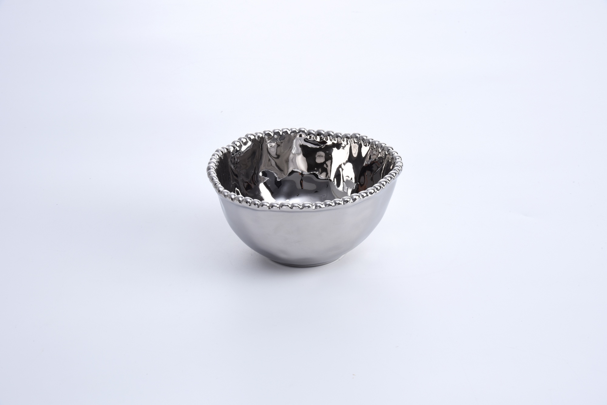 Small Bowl in Verona. Perfect for sharing snacks of almonds, peanuts, fruit, small candies, olives or dip. Crafted in a stunning silver titanium finish with lustrous silver beads. Food safe, dishwasher safe, oven safe to 350°. Tarnish and stain-free. Easy Care.