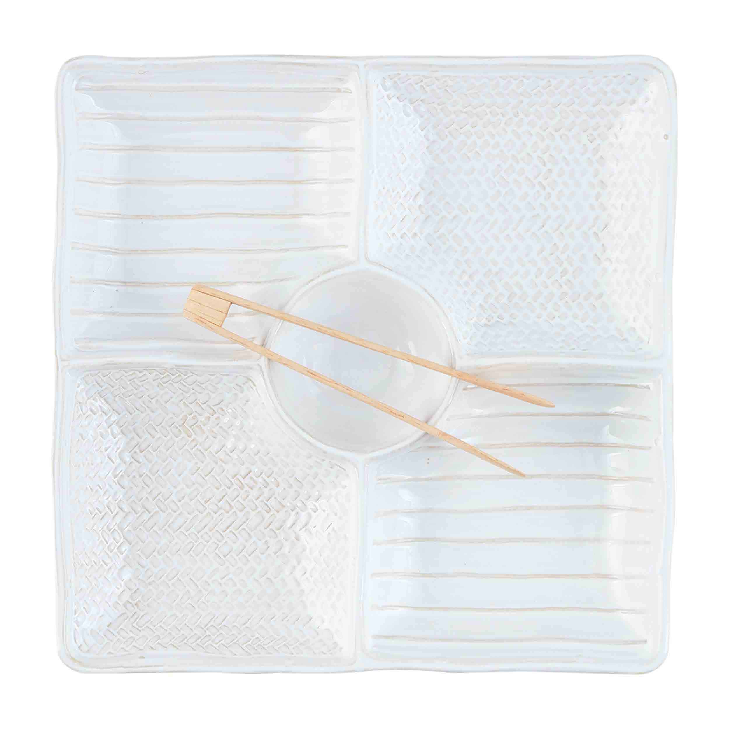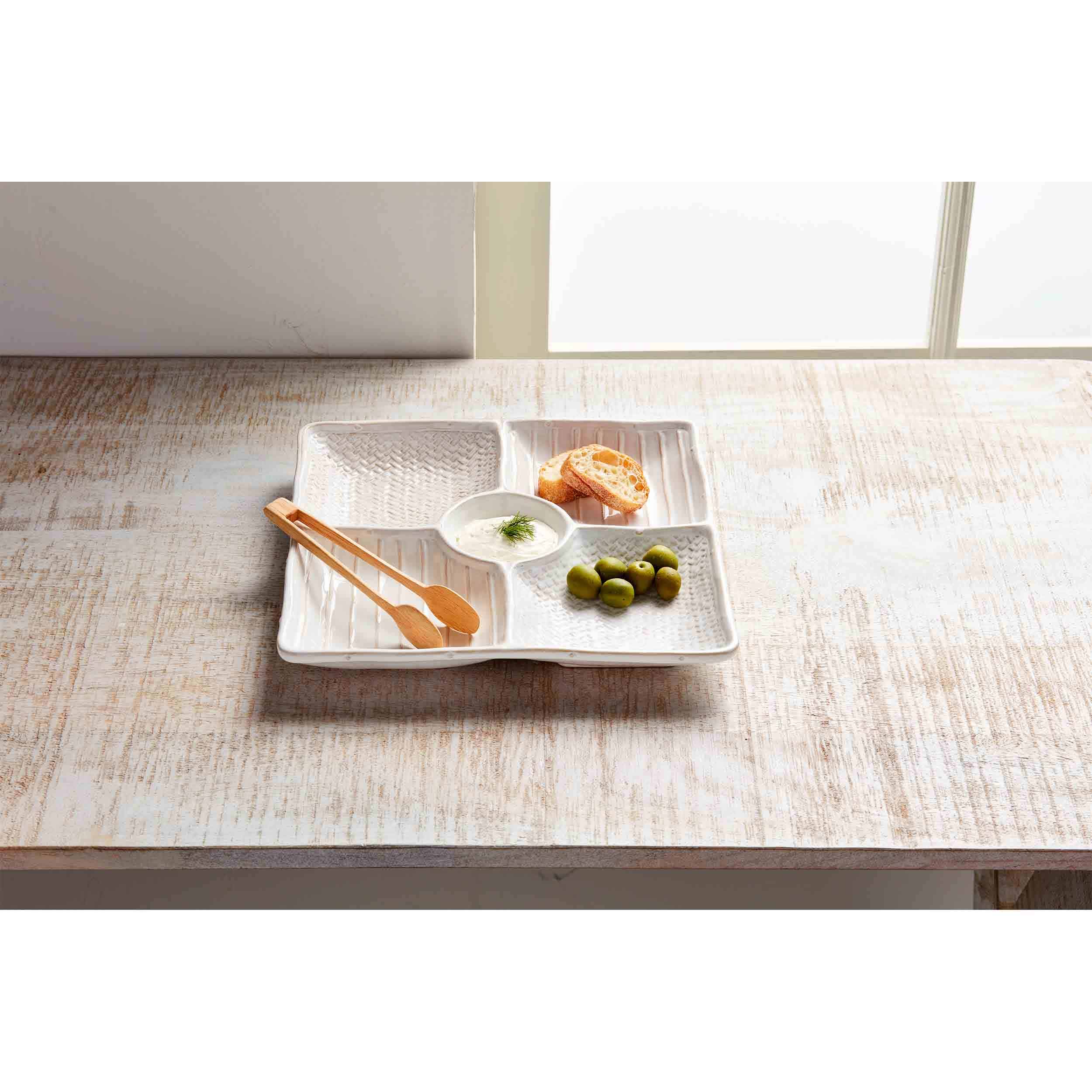 We are in awe of this Textured Sectioned Server Set. The two piece set comes with a four-sectioned stoneware serving tray. The tray features a reactive glaze finish. The serving tray features textural surface details. The serving features a center dip well. The server comes with wood tongs.