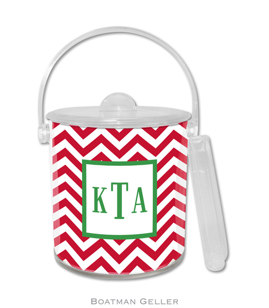 Lucite bucket with tongs. This chic double-walled acrylic ice bucket is a great holiday companion. Includes tongs and a personalized custom insert. 6.75 x 6 x 7. Hand-wash only. Pattern and color shown as is. Custom monogram/personalization options available