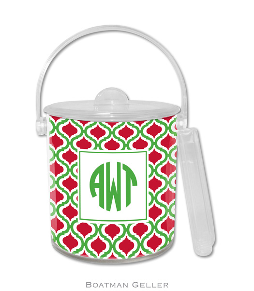 Lucite bucket with tongs. This chic double-walled acrylic ice bucket is a great holiday companion. Includes tongs and a personalized custom insert. 6.75 x 6 x 7. Hand-wash only. Pattern and color shown as is. Custom monogram/personalization options available