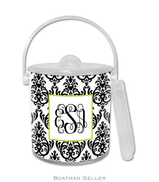 Lucite bucket with tongs. This chic double-walled acrylic ice bucket is a great holiday companion. Includes tongs and a personalized custom insert. 6.75 x 6 x 7. Hand-wash only. Pattern and color shown as is. Custom monogram/personalization options available