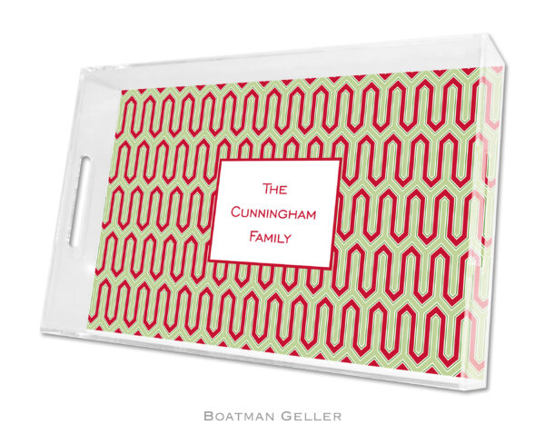 Our lucite trays are so stylish. Perfect for holiday entertaining. Available in 3 different sizes (shown in large).. Large 11×17 – $104, Small 8.5×11 – $58, Square 12×12 – $95. Pattern and color shown as is. Custom monogram/personalization options available.