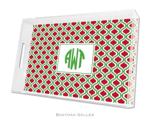 Our lucite trays are so stylish. Perfect for holiday entertaining. Available in 3 different sizes (shown in large).. Large 11×17 – $104, Small 8.5×11 – $58, Square 12×12 – $95. Pattern and color shown as is. Custom monogram/personalization options available.