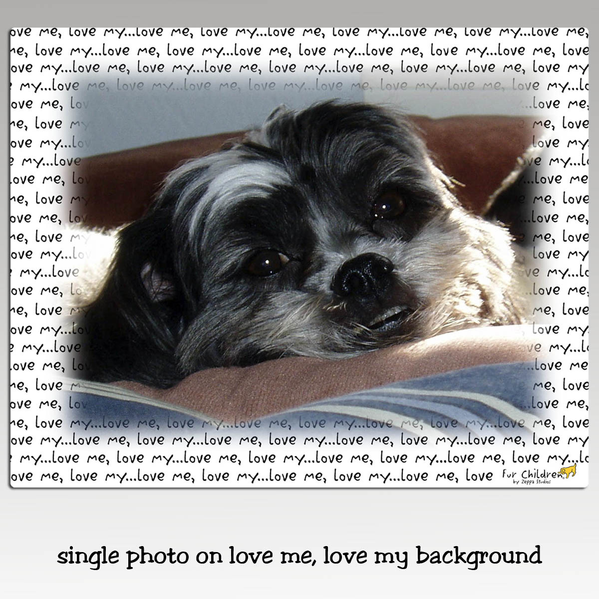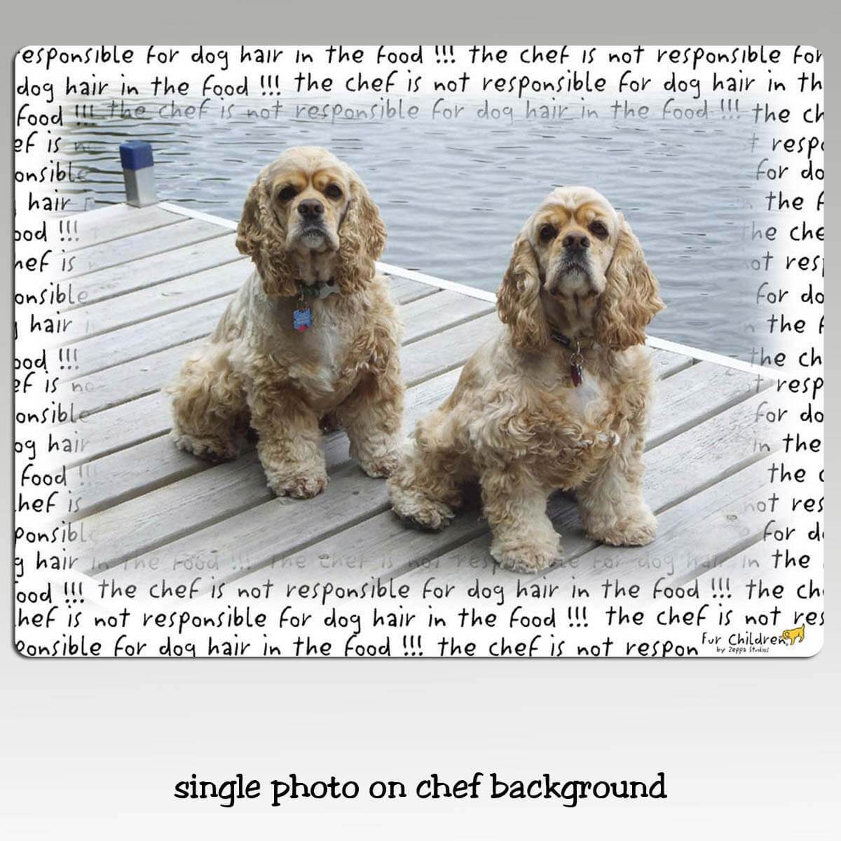 Your photo can fill the board or float on top of “the chef is not responsible for dog hair in the food!!!” (cat hair for cats, galloping gourmet for horses), “In our house dog hair is considered a condiment”, “love me, love my…” or a plain background.