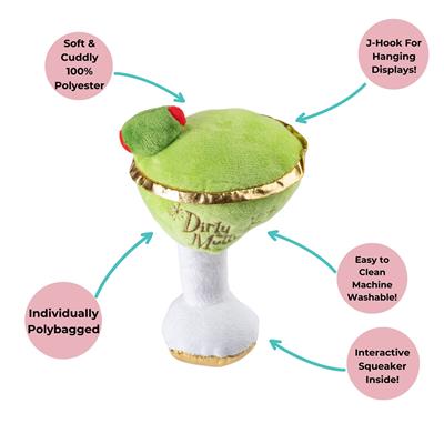 We know your pooch loves their martinis shaken–vigorously! So give them this Dirty Muttini toy and serve up a shot of fun with a dash of class. Your dog will adore this top-shelf toy that’s adorned with an olive (it is dirty, after all!). The plush exterior hides a fun squeaker inside for an all-day happy hour!