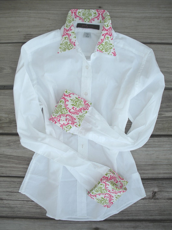 White French Cuff Shirt w/pink and chartruese green french cuffs and collar. Hand-made item, stretch poplin cotton, two back pleats. All shirts comes with a pair of silk knot cufflinks. Pink and chartruese green pattern. Womens Sizes S(4-6), M(8-10), L12-14), XL(14-16), XXL(16-18)