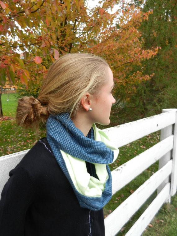 Blue on blue houndstooth with light green flannel. Hand made flannel. The infiniti scarf is two scarves in one. The blue on blue houndstooth is backed with light green flannel, the flannel will keep you warm while keeping you in style. 60″ x 10″ loop