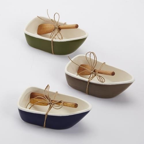 Ceramic row boat shaped dip cups feature rope rim detail and arrive with wood oar spreader.