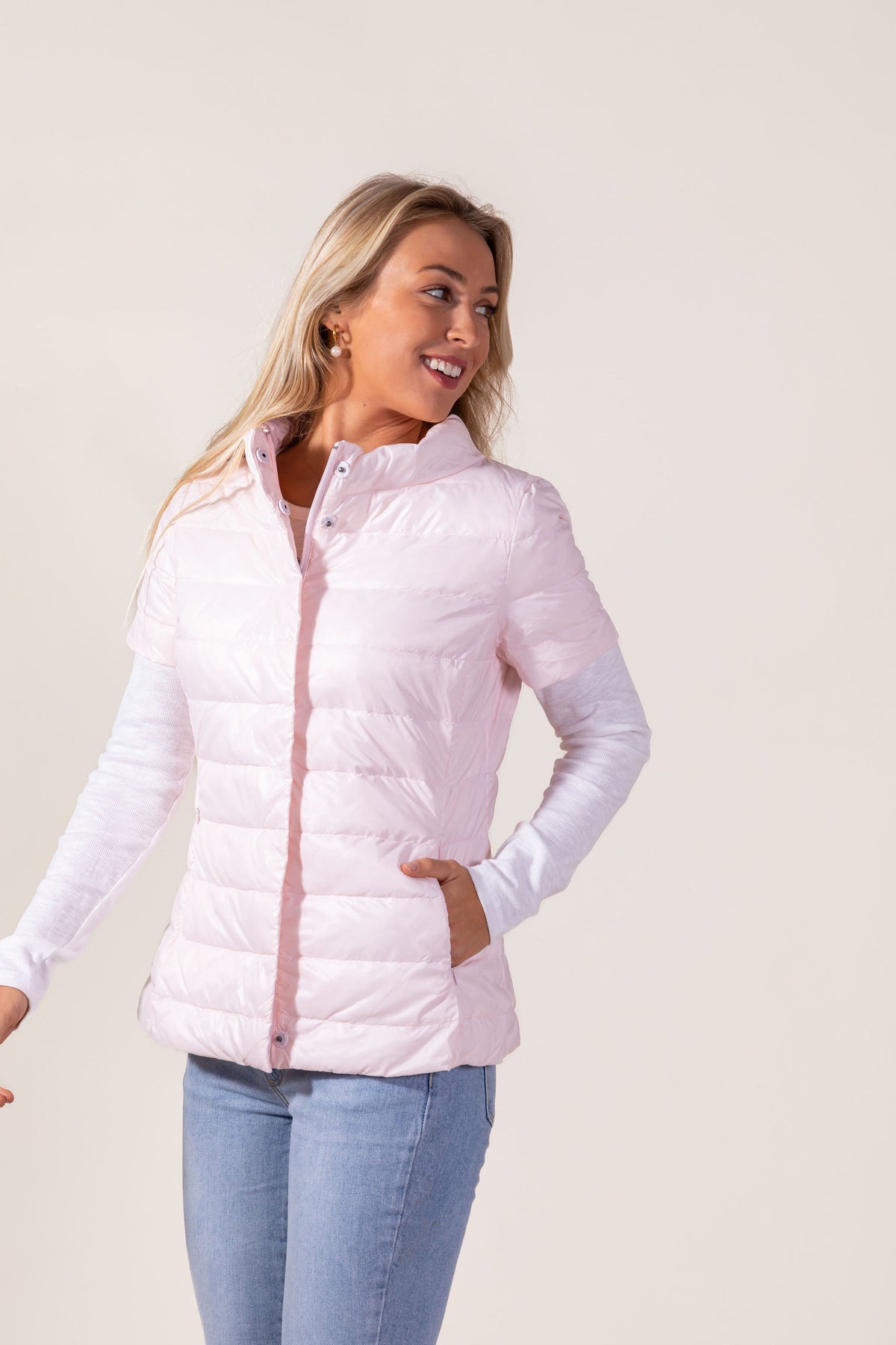 A chic Short Sleeve Puffer Jacket filled with down feathers that not only adds significant warmth and comfort to this “wear-anywhere” style but makes it a year-round must-have.